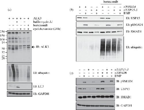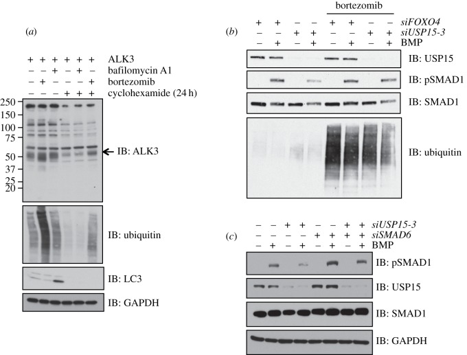 Figure 6. ALK3 undergoes proteasomal degradation. (a) HEK293 cells transfected with untagged ALK3 were treated with or without 20 μM cycloheximide for 24 h prior to lysis. Cells were treated with DMSO control, 100 nM bafilomycin A1 (to inhibit vacuolar-type H+ ATPase) or 10 μM bortezomib (to inhibit the proteasome) for 3 h prior to lysis. Extracts were resolved by SDS-PAGE and subjected to immunoblotting with the indicated antibodies. (b) HEK293 cells were transiently transfected with siFoxO4 or siUSP15-3. Cells were serum-starved overnight, treated with or without 10 μM bortezomib for 3 h and then stimulated with or without 6.25 ng ml−1 BMP for 1 h prior to lysis. Extracts were resolved by SDS-PAGE and subjected to immunoblotting with antibodies against endogenous USP15, pSMAD1 and total SMAD1. (c) HEK293 cells were transiently transfected with siFoxO4 (–), siUSP15-3 or siSMAD6 as indicated. Twenty-four hours post siRNA transfection, cells were serum-starved overnight and stimulated with or without 6.25 ng ml−1 BMP for 1 h prior to lysis. Extracts were resolved by SDS-PAGE and subjected to immunoblotting with antibodies against pSMAD1, total SMAD1, USP15 and GAPDH. The SMAD6 knockdown was confirmed by qRT-PCR (electronic supplementary material, figure S7).
