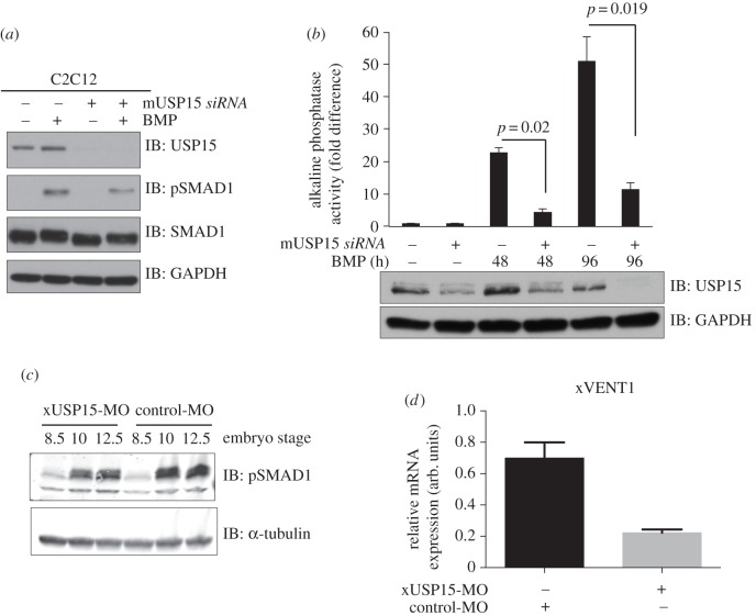 Figure 7. USP15 impacts osteoblastic differentiation in C2C12 myoblasts and modulates BMP signalling in Xenopus embryogenesis. (a) Mouse myoblast cell line C2C12 were transfected with siRNAs targeting mouse FoxO4 or USP15. Cells were serum-starved overnight and treated with or without BMP for 1 h prior to lysis. Extracts were resolved by SDS-PAGE and immunoblotted with antibodies against USP15, pSMAD1, total SMAD1 and GAPDH. (b) C2C12 cells transfected with mouse siFoxO4 or mouse siUSP15 were grown for up to 4 days in the presence of BMP. Cells were lysed and the alkaline phosphatase activity measured using a fluorescence plate reader. Data are represented as mean of three biological replicates and error bars indicate s.d. Representative extracts were resolved by SDS-PAGE and subjected to immunoblotting with antibodies against USP15 and GAPDH. (c) Xenopus embryos were injected with 80 ng of either xUSP15- (xUSP15-MO) or control-MO morpholinos at the one-cell stage and then collected at the indicated stages. Lysates were resolved by SDS-PAGE and immunoblotted with antibodies against pSMAD1 and α-tubulin. (d) qRT-PCR analysis of xVENT1 mRNA expression. Embryos were injected with 80 ng of either USP15-MO or control-MO at the one-cell stage and then animal caps were cut at stage 8.5. The animal caps were collected at the equivalent embryo stage of 10.5 and processed for qRT-PCR.
