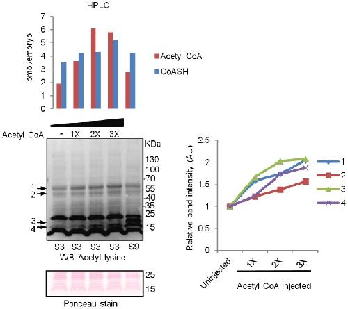 Figure 6. Microinjection of acetyl CoA to stage one embryo increases protein acetylation levels.Immediately after dejellying (30–45 minutes after fertilisation), stage one embryos were microinjected with increasing amounts of acetyl CoA, as described in the Materials and Methods section. Control embryos were injected with water. Injected embryos were allowed to progress to stage 3 and collected for HPLC analysis of CoA compounds or Western blot analysis with anti-acetyl-lysine antibody. For both analyses, 10 injected embryos were used per condition. In addition, embryos were collected after reaching stage 9. Microinjection of acetyl CoA dose dependently increased acetylation levels of several proteins (labelled 1–4). Equal protein loading was confirmed by Ponceau staining of the blot. A section of the Ponceau stained membrane is shown (the complete membrane is shown in Figure S4). For the Western blot shown, linear contrast and brightness adjustment was applied uniformly to the whole blot for clarity. The intensity/size of each of the bands numbered 1–4 was quantified and expressed relative to control embryos. |