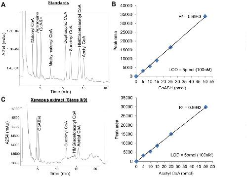 Figure 1. Chromatographic separation of CoA standards and a PCA extract of Xenopus embryos.(A) HPLC chromatogram illustrating separation of CoA compounds. Standards of CoASH, CoA thioesters and adenosine (20–50 pmol each) were separated on a C18 column (Kinetex C18 100 X 4.60 mm column with 2.6 µm particle size and 100 Å pore size) using a mobile phase consisting of 150 mM Na2H2PO4 and 9% methanol and a flow rate of 0.8 ml/min (see Materials and Methods for details). Standards were made up in mobile phase, which additionally contained 5 mM EDTA and 10 mM TCEP before injection. CoA compounds were detected by absorbance at 254 nm. Retention times (in minutes): malonyl CoA, 3.21; adenosine, 4.16; CoASH, 5.06; methylmalonyl CoA, 7.26; dephospho CoA, 10.7; succinyl CoA, 11.87; HMG/acetoacetyl CoA, 13.96; acetyl CoA, 14.83. See Table S1 for day-to-day variability in retention times. (B) Graphs showing linearity between the peak area and the amount of CoASH and acetyl CoA injected. Different amounts of CoASH and acetyl CoA standards were injected and the peak areas were determined by Borwin chromatography software. Each data point represents the mean of duplicate measurements. The limit of detection (LOD) for each compound was determined to be 5 pmol (100 nM). (C) Representative chromatogram showing separation of a PCA extract of stage 8/9 Xenopus embryos. CoA peaks were identified by comparison of retention times with those of authentic standards determined on the same day. Peaks corresponding to CoASH, succinyl CoA, HMG/acetoacetyl CoA and acetyl CoA were detected. Retention times (in minutes): CoASH, 5.21; succinyl CoA, 12.32; HMG/acetoacetyl CoA, 14.44; acetyl CoA, 15.43. |