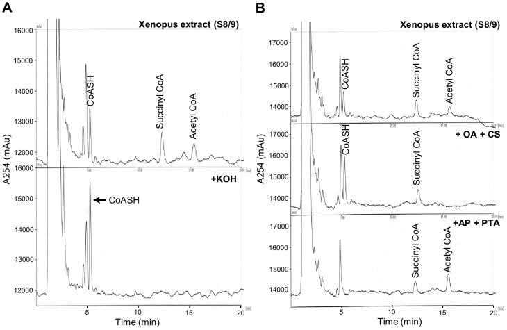 Figure 2. Validation of the identity and purity of CoASH and acetyl CoA peaks detected in Xenopus embryo extracts.(A) 30 stage 8/9 embryos were extracted with 150 µl 5% PCA and the PCA soluble fraction was neutralised with TEA/K2CO3. CoA compounds in neutralised PCA extracts were analysed by HPLC before and after KOH treatment as described in the Materials and Methods section. KOH treatment caused conversion of peaks corresponding to succinyl CoA and acetyl CoA, to free CoASH. Retention times (in minutes): CoASH, 5.15; succinyl CoA, 12.13; acetyl CoA, 15.17. (B) 30 stage 8/9 embryos were extracted with 150 µl 5% PCA and the PCA soluble fraction was neutralised with TEA/K2CO3. The neutralised extract was analysed by HPLC without further treatment (top panel), or after incubation for 10 min at 30°C with 0.11 mM oxaloacetate (OA) and citrate synthase (CS) (middel panel), or with 60 mM KCl, 9.4 mM acetyl phosphate (AP), and phosphotransacetylase (PTA) (bottom panel). Incubation of Xenopus extract with citrate synthase, in the presence of oxaloacetate, caused complete disappearance of the peak corresponding to acetyl CoA and an increase in the size of the peak corresponding to CoASH (peak areas before treatment: CoASH, 9337.25; succinyl CoA, 11626; acetyl CoA, 6678. Peak areas after treatment: CoASH, 18217.5; succinyl CoA, 11252.25; acetyl CoA, no peak detected). Conversely, incubation with phosphotransacetylase, in the presence of acetyl phosphate, completely removed the peak corresponding to CoASH and increased the size of the acetyl CoA peak (peak areas after treatment: CoASH, not detected; succinyl CoA, 9278.5; acetyl CoA, 15213.5). These results confirm unequivocally the identity of the CoASH and acetyl CoA peaks and that there are no other compounds co-eluting with these peaks that absorb at 254 nm. Retention times in minutes: top panel; CoASH, 5.17; succinyl CoA, 12.26; acetyl CoA, 15.51; middle panel; CoASH, 5.24; succinyl CoA, 12.43; acetyl CoA, not detected; bottom panel; CoASH, not detected; succinyl CoA, 12.12; acetyl CoA, 15.36. |