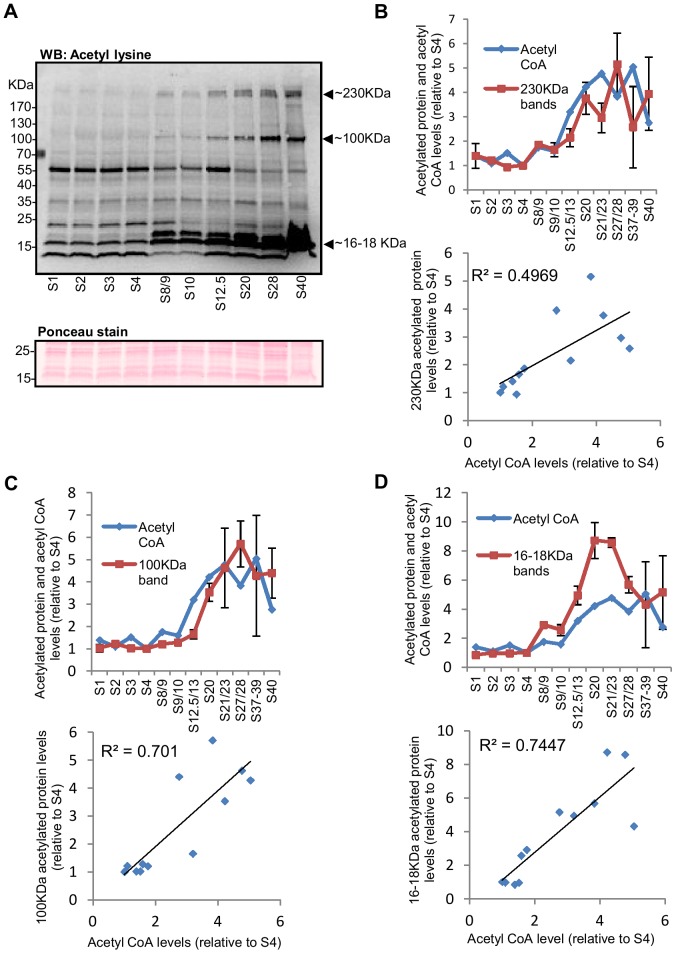 Figure 4. Whole-embryo acetylation levels of a number of proteins in Xenopus embryos appear to correlate with the pattern of change in acetyl CoA levels.(A) 20 embryos collected at different stages of development were lysed in 80 µl lysis buffer and approximately 40 µg of soluble protein was separated by SDS-PAGE, transferred to a PVDF membrane and probed with anti-acetyl lysine antibody. Equal protein loading was checked by Ponceau staining of the membrane and a Coomassie stain of a gel run in parallel. A section of the Ponceau stained membrane is shown (the complete Ponceau stained membrane and the Coomassie stained gel are shown in Figure S3). Changes in the abundance of a number of acetylated proteins, including those with molecular weights of approximately 230 KDa, 100 KDa, 16 KDa, and 18 KDa (indicated by arrows), appear to follow the overall pattern of change in acetyl CoA levels. (B–D, top graphs) Embryos at different stages of development were collected and Western blotting, with anti-acetyl lysine antibody, was performed as above. The intensity/size of acetylated protein bands at approximately 230 KDa (B), 100 KDa (C) and 16–18 KDa (D) were quantified, normalised to stage 4, and plotted against different stages of development together with levels of acetyl CoA (taken from Figure 3 and expressed relative to stage 4). Band intensity/size was normalised against stage 4 as this stage is included in all the blots performed. Each data point represents a single measurement or the mean +/− SEM of 2–7 measurements. The number of independent measurements (using samples from independent fertilisations) performed for each stage was as follows: S1 (4); S2 (4); S3 (1); S4 (7); S8/9 (1); S9/10 (7); S12.5/13 (4); S20 (5); S21 (2); S27/28 (4); S39/39 (2); S40 (3). (B–D, bottom graphs) The means of normalised band intensity/size for acetylated proteins at approximately 230 KDa (B), 100 KDa (C) and 16–18 KDa (D) were plotted against acetyl CoA levels (taken from Figure 3 and also normalised to stage 4) and R2 values are shown. |