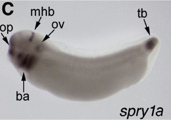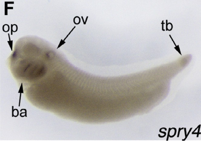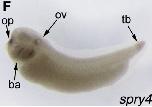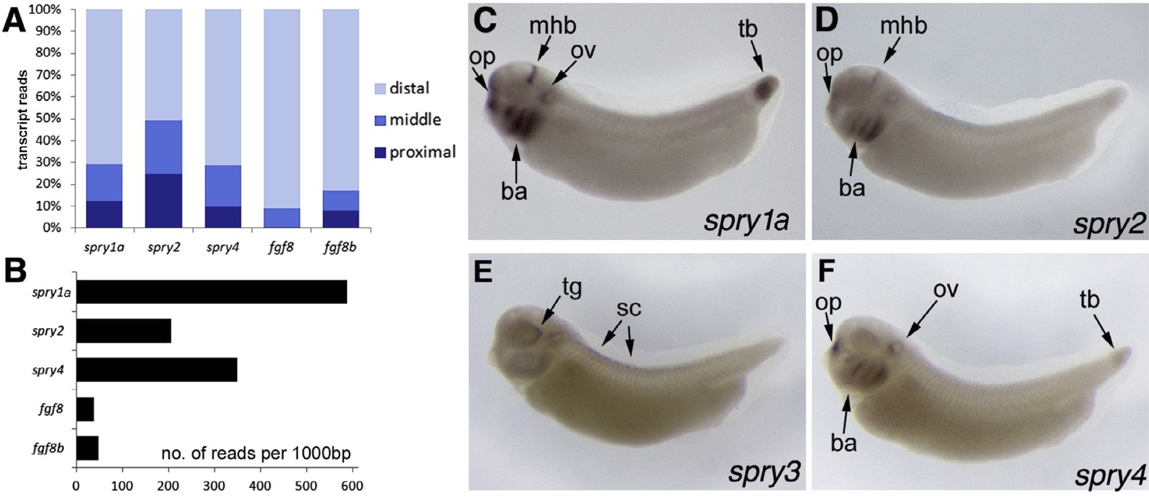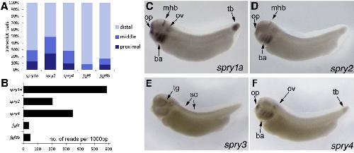 Fig. 1. Identification of three spry genes in a stage 51 limb bud transcriptome. (A) stacked column graph showing percentage of reads originating from each third of the limb bud: proximal, middle or distal. fgf8 and -8b are included for comparison. (B) Bar graph to show relative numbers of reads for each transcript across the whole limb, normalised for transcript size. Higher numbers of reads indicate higher levels of expression. (CâF) In situ hybridisation to stage 32 X. laevis embryos for spry1a, 2, 3 and 4. Abbreviations: ba: branchial arches, mhb: mid/hindbrain boundary, op: olfactory placode, ov: otic vesicle, sc: spinal cord, tb: tail bud. |