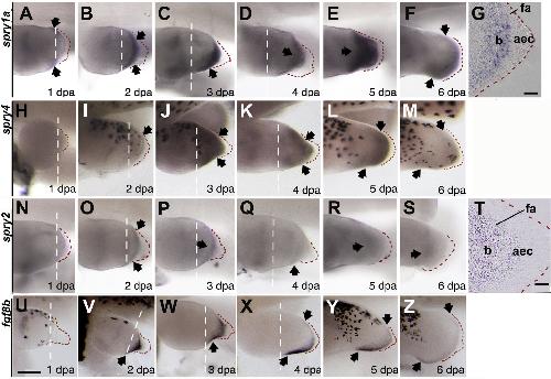 Fig. 3. In situ hybridisation of spry1a, spry4, spry2 and fgf8b in Xenopus laevis regenerating stage 52 hindlimbs from 1 to 6 days post amputation (dpa). Panels AâF; whole- mount spry1a, whole-mount panels HâM; spry4; whole-mount panels NâS, spry2. Panels UâZ show whole-mount fgf8b, which marks the functional apical ectodermal cap (AEC), for comparison. Scale bar in U is 250 lm. Specific staining is dark purple, and the distal limits of the regeneration bud AEC, which are hard to see, are outlined by red dashes. White dashed lines indicate approximate plane of the original amputation. Black spots in some panels are melanophores in pigmented specimens. Black arrows indicate de novo distal expression. Dpa in the bottom right of each panel indicates the time after amputation in days. Panels G and T are histological sections through 3 dpa regenerating hindlimbs with scale bars representing 50 lm. G) expression of spry1a is restricted to the regeneration bud (b). T) expression of spry2 is seen in the mesenchymal regeneration bud (b), the functional AEC (fa), a row of columnar epithelial cells adjacent to the mesenchyme and in the inner layers of the AEC. All limbs are oriented proximal to the left and posterior uppermost, with the tadpole on its right side. |