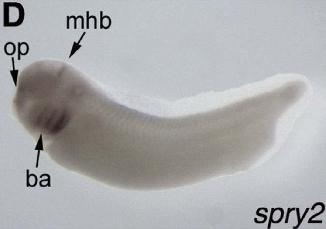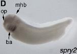 spry2 (sprouty homolog 2) gene expression in Xenopus laevis embryo, assayed via in situ hybridization, NF stage 32, lateral view, anterior left, dorsal up. |