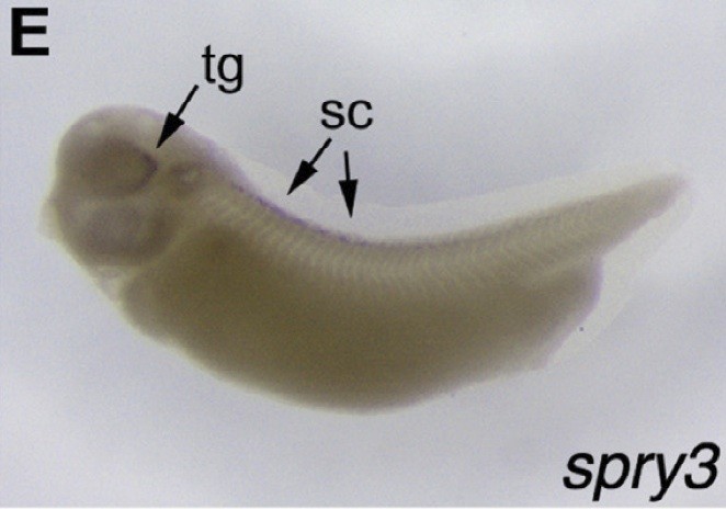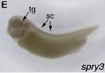 spry3 (sprouty homolog 3) gene expression in Xenopus laevis embryo, assayed via in situ hybridization, NF stage 32, lateral view, anterior left, dorsal up. |