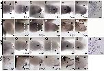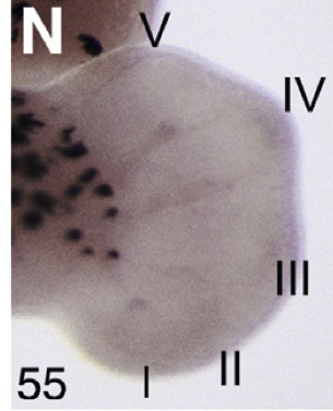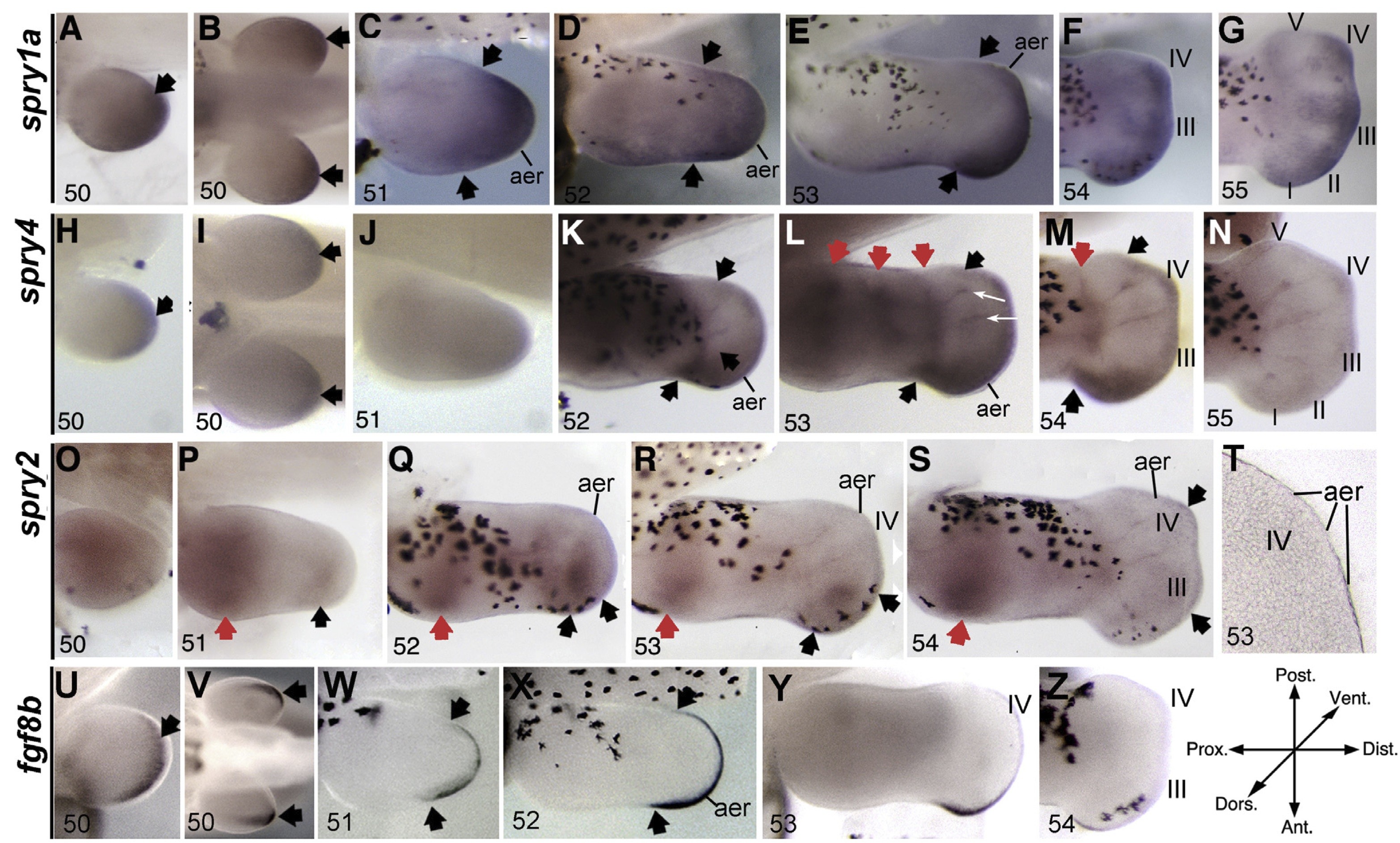 Fig. 2. In situ hybridisation of spry1a, spry2, spry4 and fgf8b in Xenopus laevis developing hindlimbs from stage 49 to 55. Fgf8b is included to show the location of the AER at developmental stages 50–54. Specific staining is dark purple. Black spots in some panels are melanophores in pigmented specimens. Black arrows indicate distal expression, red arrows localised expression in more proximal mesenchyme of older limbs, and thin white arrows indicate possible forming blood vessels. Roman numerals show detectable staining in some digits. The AER is indicated in some panels to show absence of spry1a and spry4 and presence of spry2 and fgf8b transcripts. All limbs are oriented proximal to the left and posterior uppermost, with the tadpole on its right side, except for panels B, I and V where both hind limbs are viewed from the anterior with the tadpole placed on its back. For stage 54 and 55 limbs only the autopod is shown for spry1a, spry4 and fgf8b, as by this stage there is no proximal staining. Developmental stage is in the bottom right of each panel and limbs are photographed to the same scale, except for panel T which shows histological section through a stage 53 limb bud to show expression of spry2 in the AER around digit IV. Scale bar in T is 50 um. |
