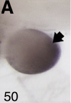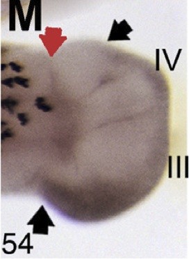 spry1 (sprouty homolog 1, antagonist of FGF signaling ) gene expression in Xenopus laevis embryo, assayed via in situ hybridization, NF stage 32, lateral view, anterior left, dorsal up. |