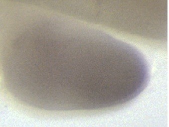 fgf8 (fibroblast growth factor 8 (androgen-induced)) gene expression in Xenopus laevis embryonic hindlimb, assayed via in situ hybridization, NF stage 51, proximal to the left and posterior uppermost, with the tadpole on right side. |