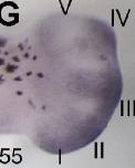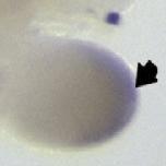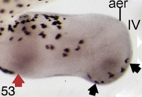 spry1 (sprouty homolog 1, antagonist of FGF signaling ) gene expression in Xenopus laevis embryonic hindlimb, assayed via in situ hybridization, NF stage 53, proximal to the left and posterior uppermost, with the tadpole on right side. |
