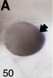 spry1 (sprouty homolog 1, antagonist of FGF signaling ) gene expression in Xenopus laevis embryonic hindlimb, assayed via in situ hybridization, NF stage 50, proximal to the left and posterior uppermost, with the tadpole on right side. |