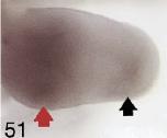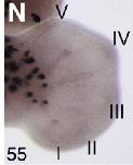spry1 (sprouty homolog 1, antagonist of FGF signaling ) gene expression in Xenopus laevis embryonic hindlimb, assayed via in situ hybridization, NF stage 52, proximal to the left and posterior uppermost, with the tadpole on right side. |