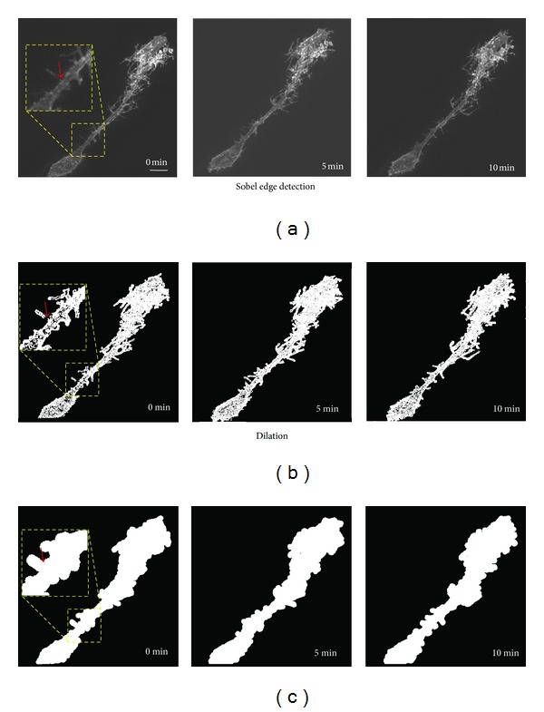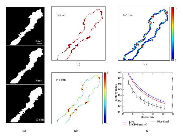 Cells such as astrocytes and radial glia with many densely ramified, fine processes pose particular challenges for the quantification of structural motility. Here we report the development of a method to calculate a motility index for individual cells with complex, dynamic morphologies. This motility index relies on boxcar averaging of the difference images generated by subtraction of images collected at consecutive time points. An image preprocessing step involving 2D projection, edge detection, and dilation of the raw images is first applied in order to binarize the images. The boxcar averaging of difference images diminishes the impact of artifactual pixel fluctuations while accentuating the group-wise changes in pixel values which are more likely to represent real biological movement. Importantly, this provides a value that correlates with mean process elongation and retraction rates without requiring detailed reconstructions of very complex cells. We also demonstrate that additional increases in the sensitivity of the method can be obtained by denoising images using the temporal frequency power spectra, based on the fact that rapid intensity fluctuations over time are mainly due to imaging artifact. The MATLAB programs implementing these motility analysis methods, complete with user-friendly graphical interfaces, have been made publicly available for download.