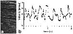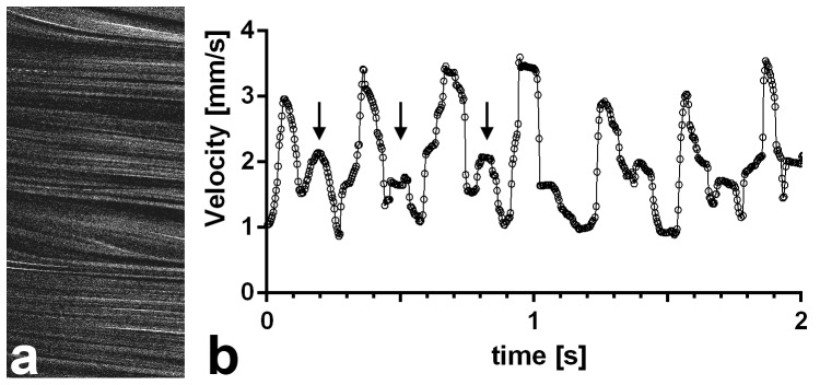 Figure 4. THG line scan measurement of the blood flow velocity in the tail artery of a stage 45 Xenopus laevis larvae (4 days post fertilization).(a) xt-representation showing 680 lines of the recording, representing the first 0.46 s of the graph in (b). (b) LS-PIV results from the two seconds depicted show values oscillating between 4 mm/s systolic and 0.9 mm/s diastolic. The higher peaks are determined by ventricular heart contractions. Arrows mark the first three secondary peaks (see main text). Calculation of the heart rate yielded a value of about 200 beats per minute, the vessel diameter was 45 µm.