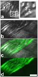 Figure 5. Visualization of the cell free layer in the cremaster muscle by THG with mirror-enhanced signals[29]. (a) RBCs are excluded from a gap near the vessel wall. Boxed area magnified on the right. 1, vessel wall. 2, THG free gap. 3, RBC tracks. (b–d) Image of the same area after injection of fluorescently labeled 40 kDa dextran. THG in gray (b,c), dextran fluorescence in green (c,d). The THG free gap is unchanged in width. Contrary to the erythrocytes, this small dextran infiltrates the cell free layer. Scale bar 20 µm. A movie of this vessel is shown in Movie S1.