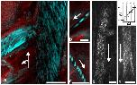 Figure 1. Intravital THG imaging of blood flow in the mouse cremaster muscle.Images were scanned with lines from top to bottom and line addition from right to left. Arrows indicate direction of blood flow. All scale bars 20 µm. (a) Combined SHG (red) and THG (cyan) image with mirror-enhanced signals [29]. In the left vessel, RBCs flow with the direction of added scan lines, therefore some are elongated to intense streaks. Image brightness was adjusted to allow simultaneous visualization of low and high intensities with a gamma value of 2. (b) Flow in this capillary was with the scan direction from right to left, therefore RBCs appear elongated. (c) Flow in this capillary was against scan direction, from left to right, RBCs therefore appear much shorter (compare scale bars). (d) RBCs flowing in a â¼25 µm vessel. RBC shapes in the image are optically deformed by the relation of blood flow velocity and the scanning process (see main text). (e) THG recording of RBCs suitable for blood flow velocity measurement. Scheme on top illustrates the principle with scanlines 0â3, see Methods for details. In the example shown scan speed was 800 lines per second, the temporal distance between two lines was thus 1.25 ms. Pixel size was 0.31 µm. Blood flow velocity was determined to be 0.75 mm/s.