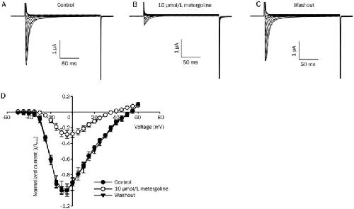 Figure 1. Effects of metergoline on neuronal Nav1.2 channel currents and the current-voltage relationship. (A–C) Oocytes were injected with wild-type Nav1.2 α- and β1-subunit cRNA and maintained for three to four days before Na+ currents were recorded in ND96 using the two-electrode voltage clamp technique. The traces are representative of six separate oocytes from three different frogs in the absence (Con) or presence of 10 μmol/L metergoline or washout. Metergoline showed substantial inhibition on the peak currents of Nav1.2. (D) The current-voltage relationship was obtained using voltage steps between −50 mV and +50 mV taken in 5-mV increments. Voltage steps were applied in the absence (•) or presence (○) of 10 μmol/L metergoline or after washout of metergoline (▾). The peaks of the evoked currents, normalized to the peak current evoked by the voltage step to −10 mV in the absence of metergoline, were used in the I–V plot. The data represent the mean±SEM (n=7–9/group).