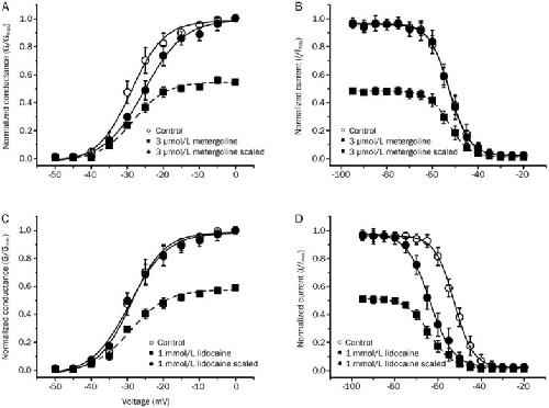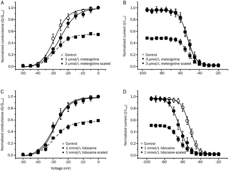 Figure 3. The effect of metergoline and lidocaine on the steady-state activation and inactivation of the Nav1.2 channel current. (A and C) Effect of metergoline or lidocaine on the steady-state activation and inactivation of Nav1.2 channel current was examined as described in a previous report15. In brief, the voltage-dependence of Na+ channel activation was calculated by measuring the peak current at test potentials ranging from −50 mV to +10 mV evoked in 5 mV increments. The voltage-dependence of conductance was compared in the absence (○) or presence (▪) of 10 μmol/L metergoline or 1 mmol/L lidocaine. The conductance curve in the presence of metergoline or lidocaine is scaled to the maximum conductance (•). Inactivation was measured using a two-pulse protocol in which oocytes were held at −100 mV and depolarized to potentials from −90 mV to −20 mV for 500 ms, followed by a test-pulse to −10 mV for 10 ms to determine channel availability. Inactivation curves are shown in the absence (○) or presence (▪) of 10 μmol/L metergoline or 1 mmol/L lidocaine. Inactivation curves in the presence of metergoline or lidocaine are scaled to the maximum (•). The data represent the mean±SEM (n= 8–10/group). The curves represent a two-state Boltzmann function as described in the Materials and methods section.