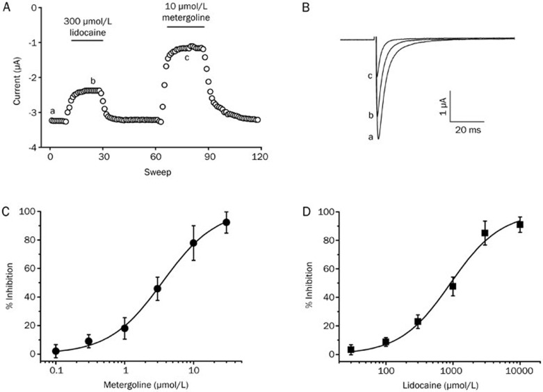Figure 2. Tonic inhibition of Nav1.2 channel currents by metergoline and lidocaine. (A) The peak inward current amplitudes (○) elicited by 200-ms depolarizations to −10 mV from a holding potential of −100 mV, evoked every 5 s. Data were obtained in eight separate oocytes from three different frogs. Metergoline (10 μmol/L) or lidocaine (300 μmol/L) were applied during the period indicated by the solid bars. (B) Averaged traces of Nav1.2 channel currents taken at the time “a”, “b”, and “c” in (A). (C and D) Concentration-response curves of metergoline or lidocaine-mediated inhibition of the peak currents of the Nav1.2 channel. Metergoline inhibited the large inward peak currents of the Nav1.2 channel in a concentration-dependent manner. The solid lines were fit using the Hill equation, as described in the Materials and methods section. The data represent the mean±SEM (n=12–15/group).