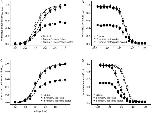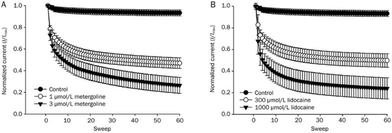 Figure 4. Use-dependent blockade of the Nav1.2 channel current by metergoline or lidocaine. (A) and (B), Sixty 20-ms depolarizing pulses to −10 mV were applied from a holding potential of −100 mV at 10 Hz in the absence or presence of metergoline [1 μmol/L (○) and 3 μmol/L (▾) in panel A] or lidocaine [300 μmol/L (○) and 1000 μmol/L (▾) in panel B] in oocytes expressing neuronal Nav1.2 channels. The peak currents were normalized to the current during the first pulse in the presence of agents to compare control current. Treatment with metergoline and lidocaine induced use-dependent inhibition of the Nav1.2 channel. Data represent the mean±SEM (n=5–7/group).