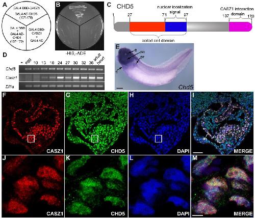 Fig. 1. CASZ1 interacts with CHD5. (A,B) Full-length CASZ1 (bait) interacts with a partial CHD5 protein (prey) in a yeast two-hybrid assay. Cells placed under âHis/âAde selection. (C) Schematic of the structure of CHD5 depicting predicted domains. (D) RT-PCR on cDNA derived from Xenopus whole-embryo lysate. Ef1a was used as a loading control. (E) Expression of Chd5 RNA by in situ analysis in early tadpole Xenopus embryos (stage 37). h, heart; pr, pronephros; e, eye; pa, pharyngeal arches. (F-M) Colocalization of CHD5 and CASZ1 protein in the nuclei of the developing Xenopus (stage 40) myocardium (m). White boxes in F-I correspond to the magnified regions in J-M. Scale bars: 500â μm in E; 50â μm in F-I; 5â μm in J-M. |