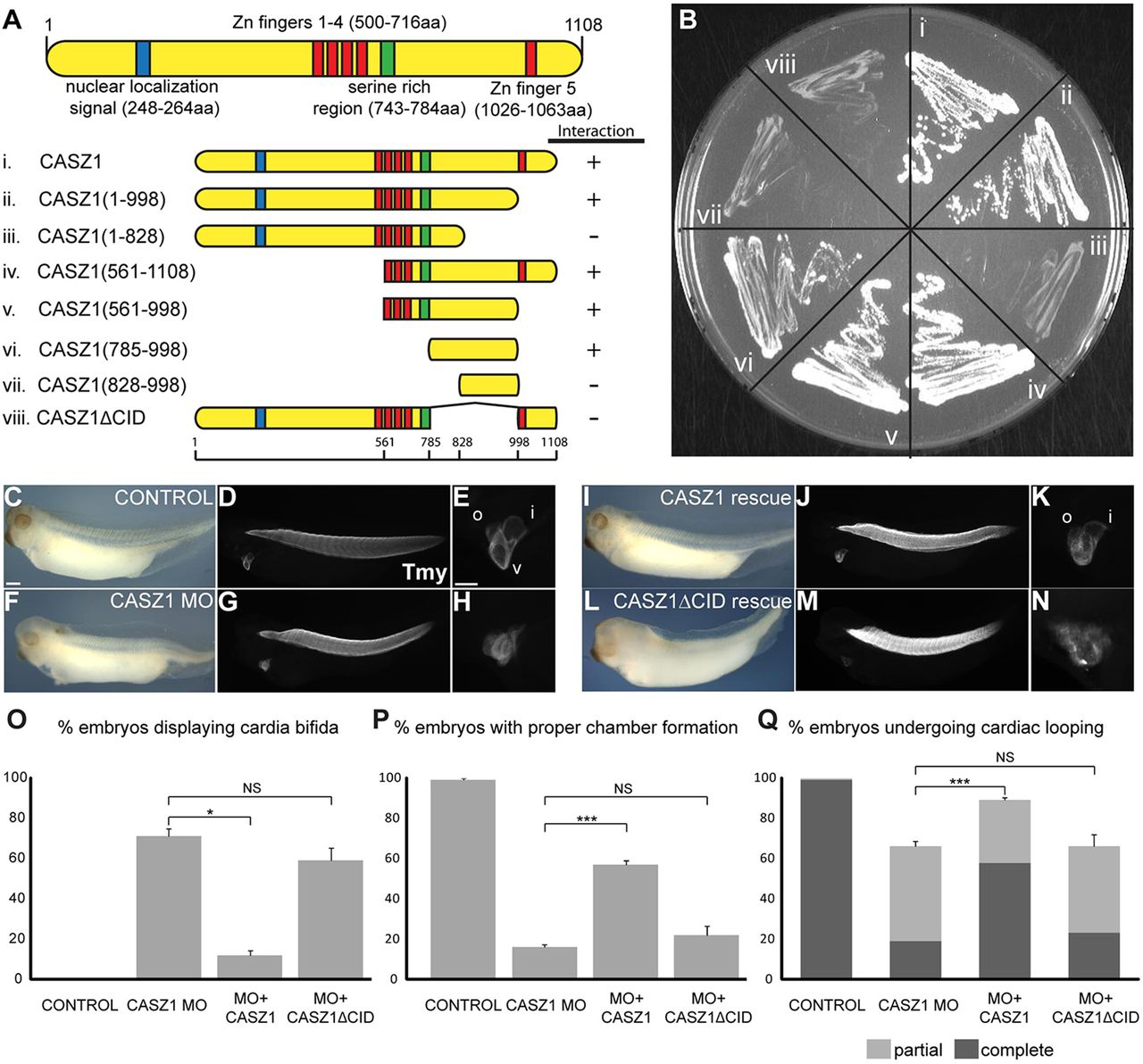 Fig. 7. CHD5 is crucial for CASZ1 function. (A,B) The region of CASZ1 containing the minimal CHD5-interacting domain amino acid residues 785-998 was identified using a yeast two-hybrid assay. (C-N) Control (C-E) and CASZ1-depleted (F-H) Xenopus embryos compared with CASZ1-depleted embryos co-injected with mRNA encoding either full-length CASZ1 (I-K) or CASZ1δCID (L-N) at early tadpole stage (stage 37). Full-length CASZ1 partially rescued cardiac looping and chamber formation (v), and outflow tract (o) and inflow tract (i) formation, whereas CASZ1δCID failed to rescue any aspect of cardiogenesis. (O-Q) Three independent experiments (n>20 per condition) of embryos were scored for cardia bifida (O), degree of proper cardiac looping (P) and chamber formation (Q) using whole-mount staining with anti-tropomyosin antibody. Fisher's exact test was performed for significance: NS, not significant; *P=0.003; ***P<0.0001. Error bars represent calculated s.e.m. Scale bars: 500â μm in C,D, F,G,I,J,L,M; 100â μm in E,H,K,N. |