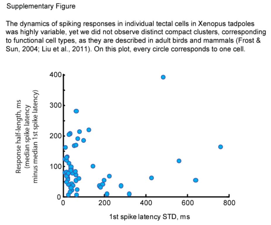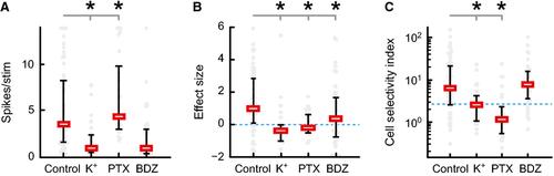 Figure 6. Pharmacological modulation of OT network activity. In every panel, columns of data represent different experimental conditions [left to right: control experiments, high K+ ACSF, GABAergic transmission blocked with picrotoxin (PTX), and GABAergic transmission enhanced by diazepam (BDZ)]. Gray circles show individual cell data, red boxes indicate medians, whiskers show interquartile ranges, and gray lines and asterisks indicate significance levels of P < 0.05 compared with control; outliers are brought into axes limits. (A) Average number of spikes per stimulus (averaged across all five stimulus types from our assay) generated by OT cells in different solutions. (B) Effect size for OT looming stimulus selectivity (difference between spike outputs in response to ‘crash’ and ‘flash’, normalised by response variability); dashed line marks effect reversal. (C) Index of individual selectivity of OT cells (see definition in 2). Dashed line indicates the value (2.4), which with our sample sizes corresponded to PANOVA of 0.05 (significance threshold for individual OT cell selectivity, without a false discovery rate adjustment).