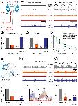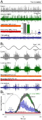 Figure 4. Effect of benzocaine on extraocular motoneuronal discharge in Xenopus tadpoles.A-B, Single sweeps of spontaneous (A), roll motion (Tpos)-evoked (B1) multiple-unit discharge of the superior oblique (SO) eye muscle-innervating trochlear nerve and average firing rate modulation (± SEM, shaded areas; B2) over a single cycle (dashed line; B2) before (Control, gray traces and plot), 10 min after application of dimethylsulfoxide (Control w/DMSO, green traces and plot), 5 min (orange traces) and 15 min after application of benzocaine (0.05%; red traces) and four hours after wash-out (blue traces and plot); inset in A show relative resting rates before (gray), in the presence of DMSO (green), benzocaine (orange and red, complete block) and after wash-out (blue); number of experiments in parentheses; while no significant change (n.s., p = 0.880) of the peak firing rate occurred after adding DMSO to the bath, benzocaine (0.05%) blocked the motor responses entirely (***, p≤0.0001). |