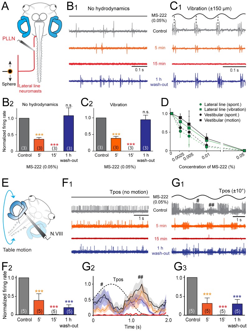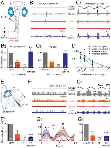 Figure 5. Effect of MS-222 on the spike discharge of mechanoreceptor sensory afferent fibers in Xenopus tadpoles.A, Schematic of the experimental setting depicting the semi-intact preparation, vibrational stimulation of lateral line neuromasts (10 Hz, ±150 µm) and extracellular recordings of the multiple-unit discharge of the peripheral portion of the posterior lateral line nerve (PLLN). B,C, Single sweeps of spontaneous (B1) and vibration-evoked discharge modulation (C1) in the PLLN before (Control, gray traces and plots), 5 min (orange traces and plots) and 15 min after bath-application (red traces and plots) and after wash-out (blue traces and plots) of MS-222 (0.05%); relative resting (B2) and peak firing rates (C2) before, during and after wash-out show the reversible drug effect; number of experiments in parentheses. D, Dose-response curve of MS-222 on multiple-unit spontaneous and sensory stimulus-evoked spike discharge modulation in mechanosensory (lateral line and vestibular) nerve fibers. E, Schematic of the experimental setting depicting the semi-intact preparation, roll-axis turntable positional changes (Tpos, 0.5 Hz, ±10°) and extracellular recordings of the multiple-unit discharge of the peripheral portion of N.VIII (vestibular). F,G, Single sweeps of spontaneous (F1) and roll motion-evoked discharge modulation (G1) of the N.VIII and average firing rate modulation (± SEM, shaded areas; n = 8, respectively) over a single cycle (dashed line; G2) before (Control, gray traces and plots), 5 min (orange traces and plots) and 15 min after bath-application (red traces and plots) and after wash-out (blue traces and plots) of MS-222 (0.05%); #,## in G1,2 indicate activated responses in different nerve fibers by either direction of the sinusoidal roll motion; relative resting (F2) and peak firing rates (G3) before, during and after wash-out show a complete block and partially reversed drug effect; number of experiments in parentheses; ***, p≤0.0001; n.s., not significant. |