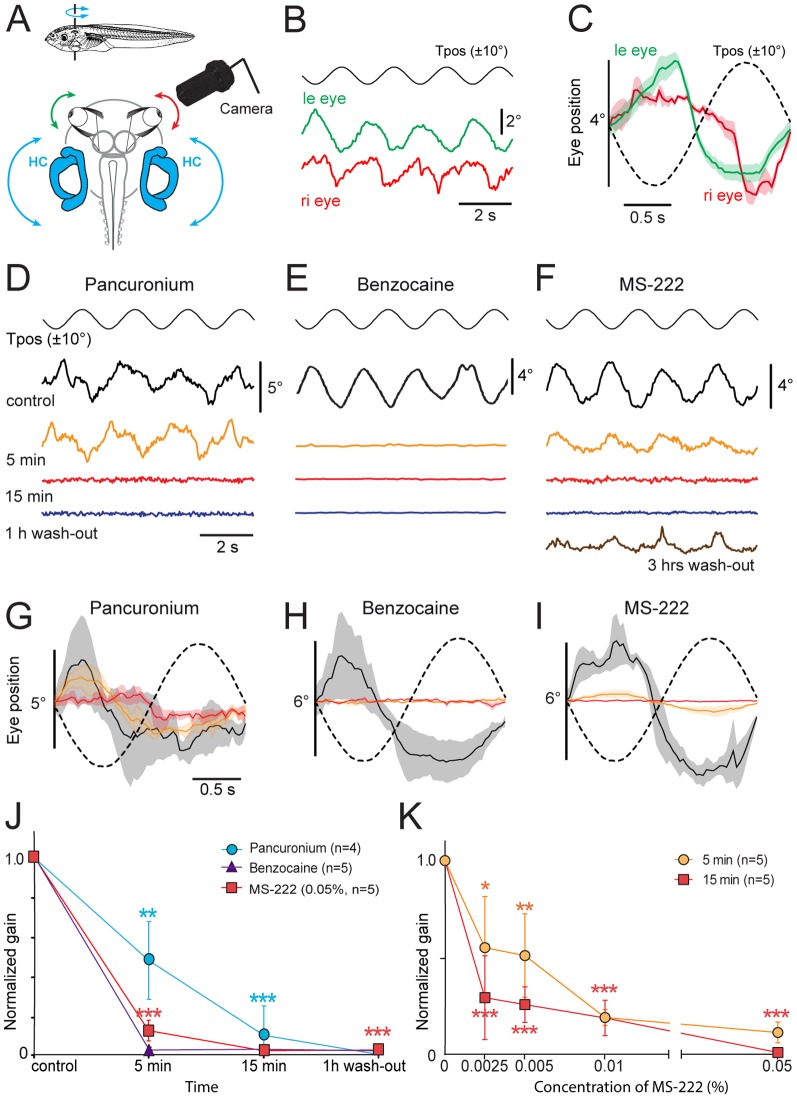 Figure 2. Effect of pancuronium, benzocaine and MS-222 on the horizontal aVOR in Xenopus tadpoles.A, Schematic of the experimental setting depicting the semi-intact preparation, horizontal sinusoidal turntable positional changes (Tpos; 0.5 Hz, ±10°) and video capture of eye motion. B,C, Single sweeps of co-aligned horizontal positional oscillations of the left (green) and right (red) eye, extracted from video sequences during turntable rotation (B) and average responses (± SEM, shaded areas; n = 8) over a single cycle (C); note that table and eye motion are oppositely directed in agreement with aVOR behavior. D-I, Effect of bath-applied pancuronium (0.12 mg/ml, D,G), benzocaine (0.05%, E,H) and MS-222 (0.05%, F,I) on single sweeps of horizontal sinusoidal turntable motion (Tpos)-evoked eye movements (D-F) and average response (± SEM, shaded areas; n = 8, respectively) over a single cycle (dashed line; G-I); recordings (same color code in G-I) were obtained before (Control, black traces), 5 min (orange traces) and 15 min (red traces) after onset of drug application as well as 1 hour (blue traces, D-F) and 3 hours after beginning of the wash-out (brown trace, F). J, Progression of pharmacological influence on eye motion gain (ratio of eye/table motion magnitude) after application/wash-out of pancuronium, benzocaine and MS-222. K, Dose-response curve of MS-222 impact on the gain of rotation-induced eye motion 5 and 15 min after drug application; the significance of difference in J,K is indicated: *, p≤0.01; **, p≤0.001; ***, p≤0.0001, with respect to control values. Calibration bars in D,G also apply to E,F and H,I, respectively. |