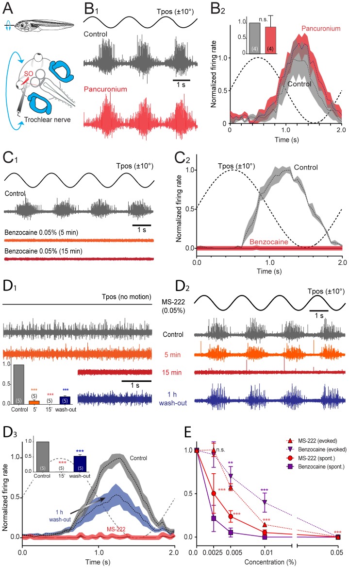 Figure 3. Effect of pancuronium, benzocaine and MS-222 on extraocular motoneuronal discharge in Xenopus tadpoles.A, Schematic of the experimental setting depicting the semi-intact preparation, roll-axis turntable positional changes (Tpos, 0.5 Hz, ±10°) and extracellular recordings of spontaneous and motion-evoked multiple-unit discharge of the superior oblique (SO) eye muscle-innervating trochlear nerve. B-D, Single sweeps of sinusoidal roll motion (Tpos)-evoked discharge modulation (B1,C1,D2), spontaneous firing of the trochlear nerve (D1) and average firing rate modulation (± SEM, shaded areas) over a single cycle (dashed line; B2,C2,D3) before (Control, gray traces and plots), 5 min (orange traces and plots), 15 min (red traces and plots) and after wash-out (blue traces and plots) of bath-applied pancuronium (0.12 mg/ml, B), benzocaine (0.05%, C) and MS-222 (0.05%, D); inset in B2 shows relative peak firing rates before (gray) and after pancuronium application (red); insets in D1,3 show relative resting rates (D1) and peak firing rates during roll motion stimulation (D3) before and during drug application and after wash-out; number of experiments in parentheses in insets; while no significant change (n.s., p = 0.975) of the peak firing rate occurred after adding pancuronium to the bath (B), benzocaine (C) and MS-222 (D) blocked the motor responses entirely (***, p≤0.0001). E, Dose-response curve of benzocaine and MS-222 (n = 20, respectively) on spontaneous and motion-triggered peak modulation values of multiple-unit trochlear motor spike discharge. |