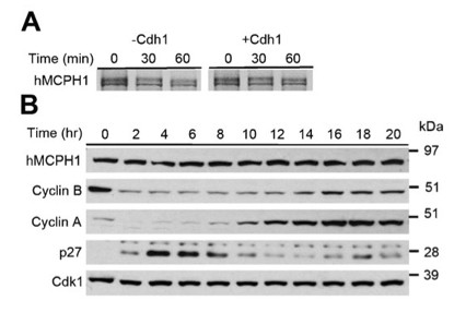 Fig. S2. APC does not regulate the stability of hMCPH1. (A) Autoradiogram of radiolabeled hMCPH1 incubated in Xenopus interphase egg extract in the absence or presence of Cdh1. (B) Levels of hMCPH1 do not notably fluctuate in a cell cycle-dependent manner. Immunoblot analysis of hMCPH1, Cyclin B, Cyclin A, p27, and Cdk1 in lysates derived from synchronized HeLa cells 0â20 hours after nocodazole release. Degradation of Cyclin A and B occurs in prophase and metaphase, respectively, whereas degradation of p27 marks late G1/S.