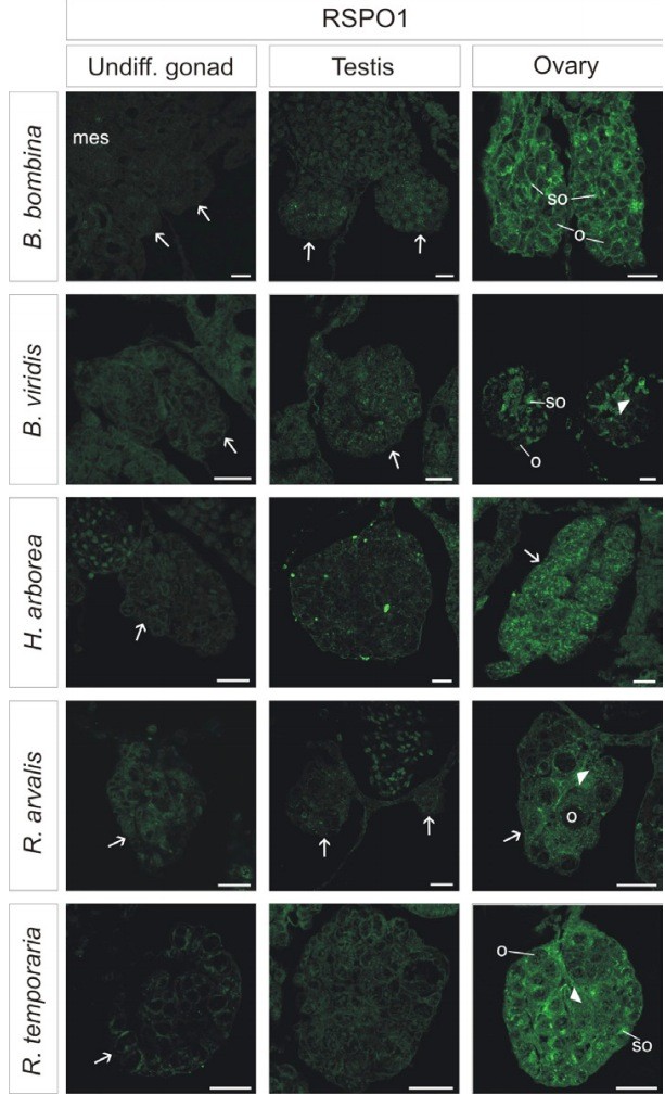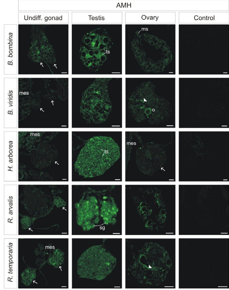 Sexual dimorphism of AMH, DMRT1 and RSPO1 localization in the developing gonads of six anuran species.
