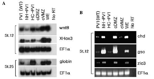RNA extraction. PV.1 and HC-PV1 overexpression induces ventral marker genes (A) and suppresses dorsal specific early genes (B) while NH-PV1