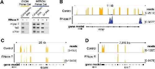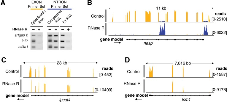 FIGURE 2. Cytoplasmic sisRNAs are resistant to RNase R. (A) Cytoplasmic RNA was treated with RNase R or water and then used for RT–PCR amplification of exonic and intronic sequences from three genes. Intronic, but not exonic, sequences were resistant to RNase R and could still be amplified. The same intronic sequences (ivt RNA), when derived from in vitro-transcribed RNA, were digested by RNase R and did not amplify. (B) Cytoplasmic RNA was digested with RNase R and subjected to deep sequencing. The upper track (control) shows that cytoplasmic sisRNA sequences (blue) are rare relative to the coding sequences (yellow) of the nasp gene. The lower track (RNase R treated) shows that the sisRNA sequences are resistant to the enzyme, whereas the mRNA is almost completely digested. (C) A relatively rare case in which an mRNA is resistant to RNase R digestion (lpcat4). Presumably, digestion began at the 3′ end of the mRNA but could not proceed past the middle of the last exon. (D) A circular molecule derived from two exons without the intervening intron in the gene lsm1. Such molecules could arise by “backsplicing,” as recently described for human fibroblasts (Jeck et al. 2013).