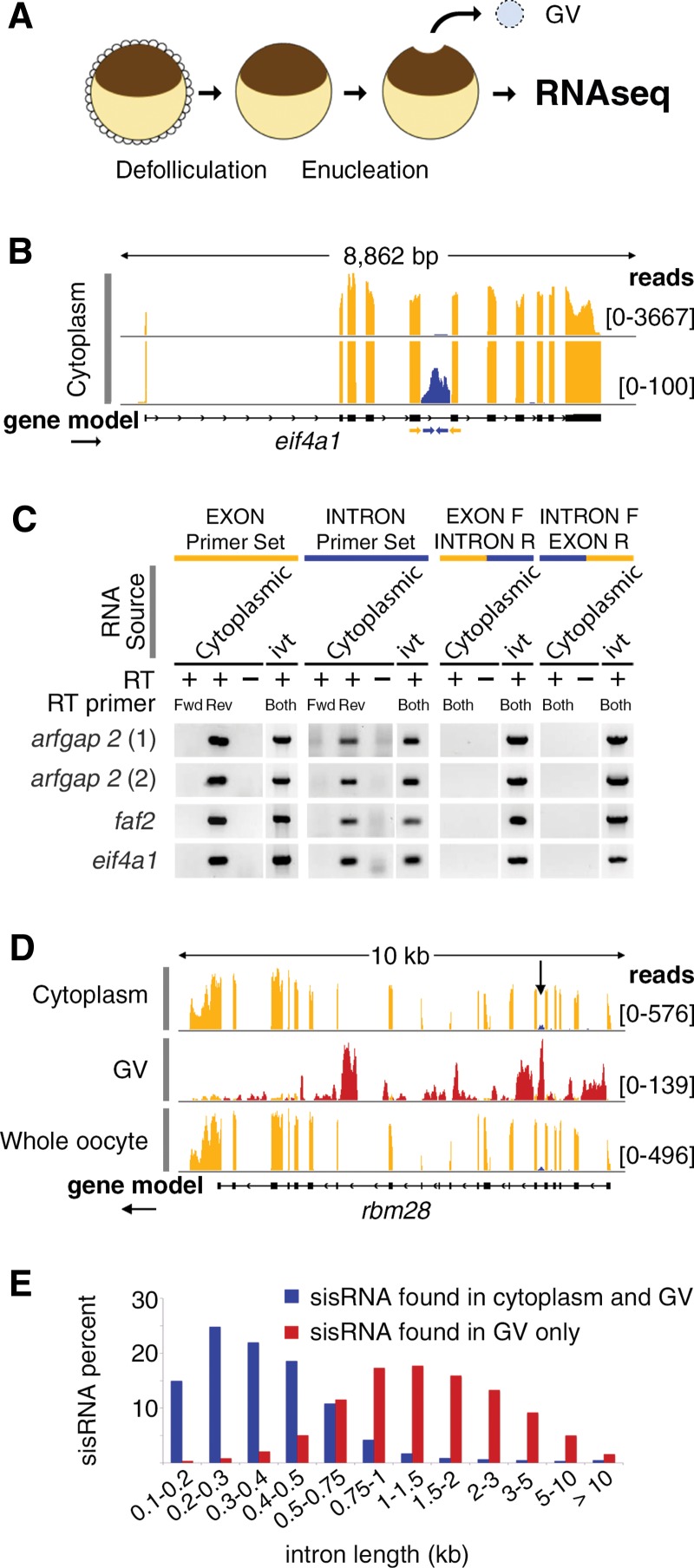 FIGURE 1. Characterization of cytoplasmic sisRNAs. (A) The oocyte nucleus or germinal vesicle (GV) can be removed from a defolliculated oocyte within seconds to provide a sample of cytoplasm uncontaminated with nuclear RNA. (B) IGV browser view of a typical gene bearing a cytoplasmic sisRNA. Cytoplasmic intronic reads (blue) occur in one intron of the eif4a1 gene (yellow exonic reads). The lower track (track height 100 reads) shows that the intronic reads do not cross the intron–exon borders. The yellow and blue arrows represent exonic and intronic primers used for RT–PCR. (C) RT–PCR results showing that cytoplasmic sisRNAs are derived from the sense strand and do not cross the intron–exon borders. (ivt) In vitro transcribed RNA, used as a control template. (D) Comparison of cytoplasmic, nuclear (GV), and whole oocyte RNAs from the rbm28 gene. Cytoplasmic and whole oocyte RNAs are essentially identical (arrow points to cytoplasmic sisRNA, blue reads). Nuclear sisRNAs (red reads in GV track) are not detectable in the whole oocyte sample. (E) Distribution of sisRNAs relative to intron length. The majority of cytoplasmic sisRNAs (blue) derive from shorter introns, whereas nuclear-specific sisRNAs (red) come from a wide range of longer introns.