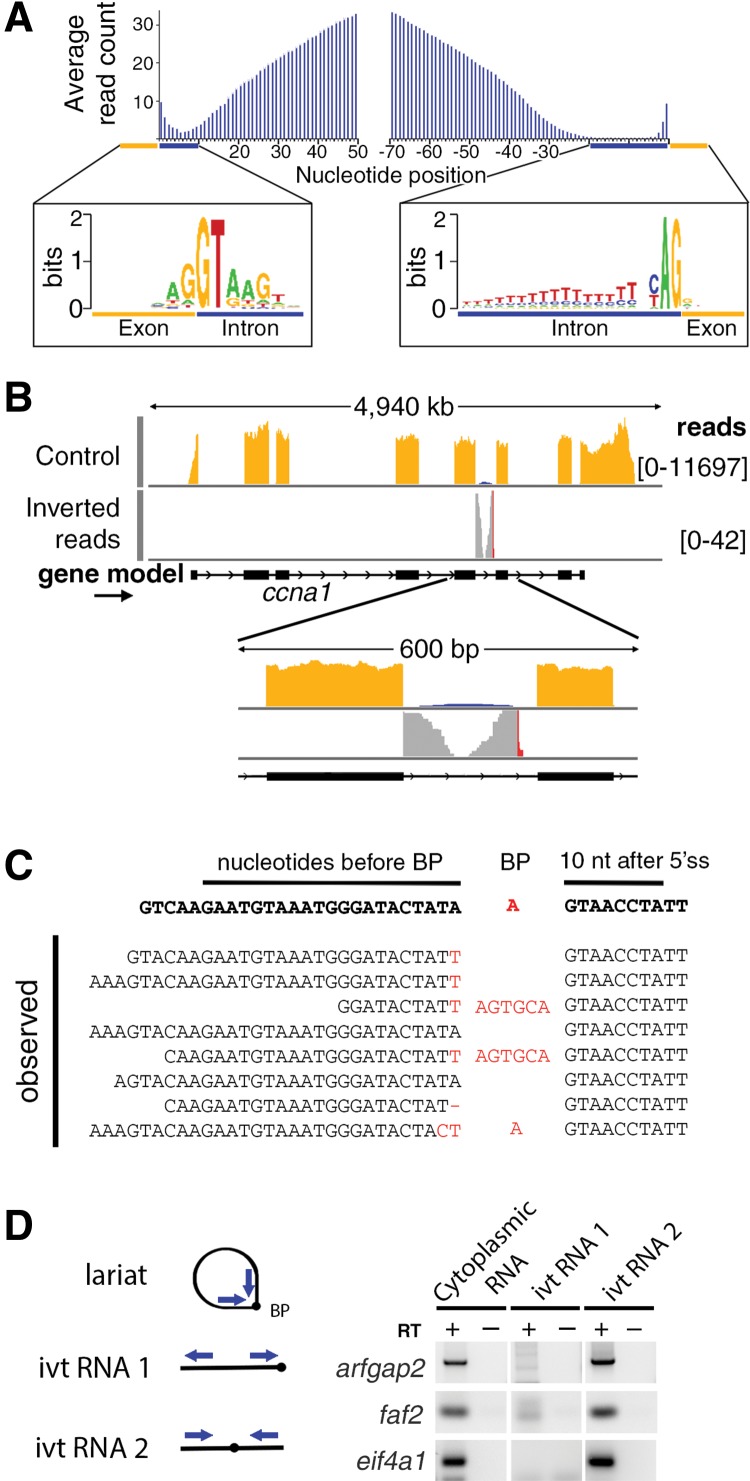FIGURE 3. Evidence that cytoplasmic sisRNAs are circles (lariats without tails). (A) Plot of average read number per nucleotide for 200 sisRNAs relative to nucleotide position within the intron. Reads abut the 5′ end of the intron, but are absent from a region of ∼30 nt next to the 3′ end. Consensus nucleotides are shown for positions near the ends of the introns. (B) Inverted reads contain sequences that cross the splicing branchpoint and can be mapped when appropriately split (Taggart et al. 2012). (C) Some inverted reads contain sequence errors or nucleotides inserted at the branchpoint (red nucleotides), presumably by the reverse transcriptase used for library production. (D) Cytoplasmic sisRNAs yield an RT–PCR product when amplified with outward-facing primers. These same primers amplify in vitro-transcribed RNA only when the branchpoint is in the interior of the molecule. See text for details of cloning and sequencing of the RT–PCR products.