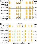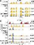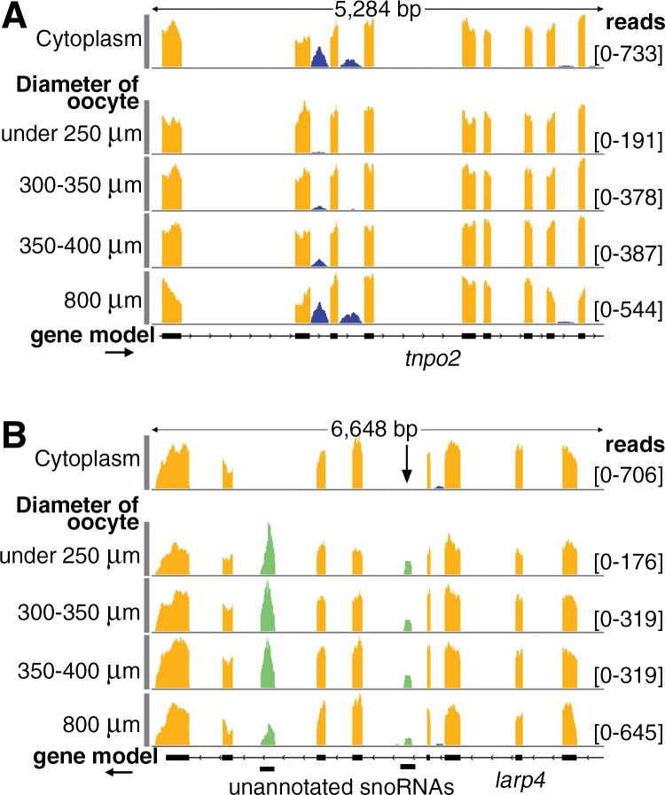 FIGURE 5. During oogenesis cytoplasmic sisRNAs but not snoRNAs increase in abundance relative to mRNAs. (A) Cytoplasmic sisRNAs (blue) occur in three introns of the tnpo2 gene (top track, cytoplasm from mature oocyte). During oogenesis these sisRNAs increase in abundance relative to exonic sequences (four lower tracks, total RNA from oocytes of increasing size). (B) During oogenesis two nuclear snoRNAs (green) maintain a roughly constant ratio relative to cytoplasmic exonic sequences (yellow). The arrow points to a snoRNA whose size and abundance is similar to that of the sisRNAs detected in A. The exclusively nuclear location of the snoRNA sequences is shown by their absence from cytoplasm of mature oocytes (top track).