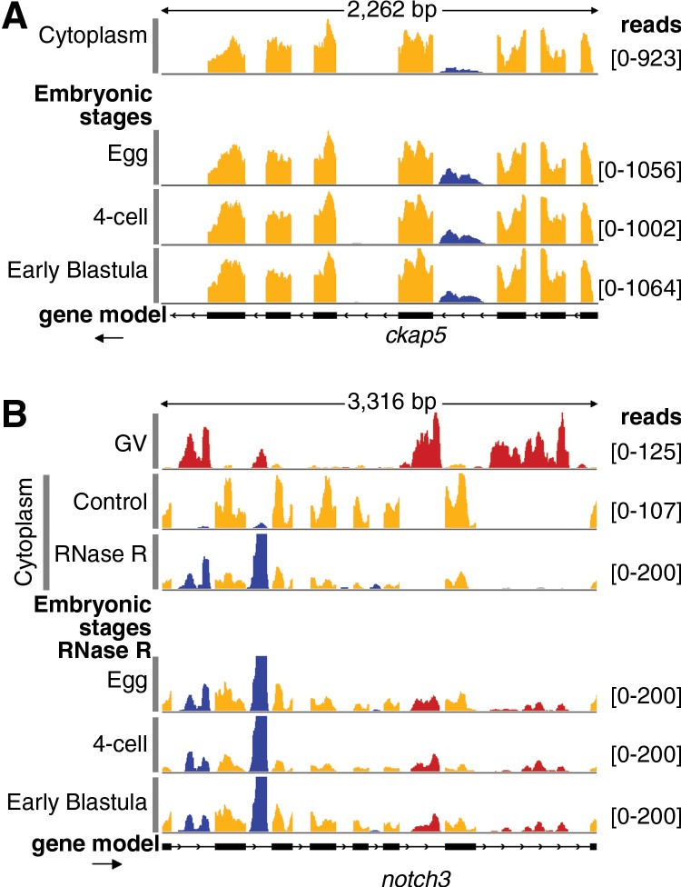 FIGURE 6. Persistence of sisRNAs in the early embryo. (A) A prominent cytoplasmic sisRNA in the ckap5 gene (top track, blue) persists in the egg, 4-cell, and early blastula stages. (B) The top two tracks show nuclear sisRNAs (red) in the GV and cytoplasmic sisRNAs (blue) in the cytoplasm of mature oocytes. The third track shows that cytoplasmic sisRNAs (blue) are resistant to RNase R relative to the mRNA (yellow). Note that nuclear sisRNAs are not seen in this cytoplasmic sample, attesting to its purity. The bottom three tracks show egg, 4-cell, and early blastula RNA treated with RNase R. These samples show persistence not only of cytoplasmic sisRNAs (blue) but also of nuclear sisRNAs (red) derived from GV breakdown at the time of fertilization.