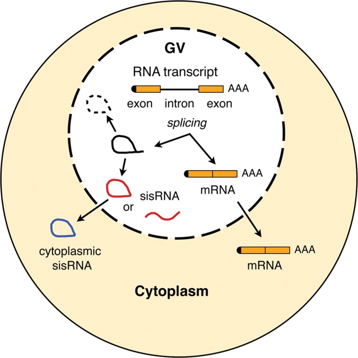 We previously demonstrated that the oocytenucleus (germinal vesicle or GV) of Xenopus tropicalis contains a population of stable RNA molecules derived from the introns of most expressed genes. Here we show that similar stable intronic sequence (sis) RNAs occur in the oocytecytoplasm. About 9000 cytoplasmic sisRNAs have been identified, all of which are resistant to the exonuclease RNase R. About half have been confirmed as lariat molecules and the rest are presumed to be lariats, whereas nuclear sisRNAs are a mixture of lariat and linear molecules. Cytoplasmic sisRNAs are more abundant on a molar basis than nuclear sisRNAs and are derived from short introns, mostly under 1 kb in length. Both nuclear and cytoplasmic sisRNAs are transmitted intact to the egg at GV breakdown and persist until at least the blastula stage of embryogenesis, when zygotic transcription begins. We compared cytoplasmic sisRNAs derived from orthologous genes of X. tropicalis and X. laevis, and found that the specific introns from which sisRNAs are derived are not conserved. The existence of sisRNAs in the cytoplasm of the oocyte, their transmission to the fertilized egg, and their persistence during early embryogenesis suggest that they might play a regulatory role in mRNA translation.