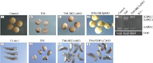 Fig. 2. Developmental defects caused by tunicamycin (TM) were rescued with the injection of IRE1αMO and xXBP1(C) MO.A: control MO injected embryos at stage 18. B: embryos treated with 2â μg/mL TM at stage 18. C: embryos treated with 2â μg/mL TM and injected with 50 ng IRE1αMO at stage 18. D: embryos treated with 2â μg/mL TM and injected with 50 ng IRE1βMO at stage 18. E: rescue effect on XBP1 splicing. TM treatment led to an increase of xXBP1(C) while TM treatment together with xIRE1α MO injection rescued the change in embryos at stage 11. F: control MO injected embryos at stage 32. G: embryos treated with 2â μg/mL TM at stage 32. H: embryos treated with 2â μg/mL TM and injected with 50â ng IRE1αMO at stage 32. I: embryos treated with 2â μg/mL TM and injected with 50 ng XBP1(C) MO at stage 32. RT-: no-reverse transcriptase control.