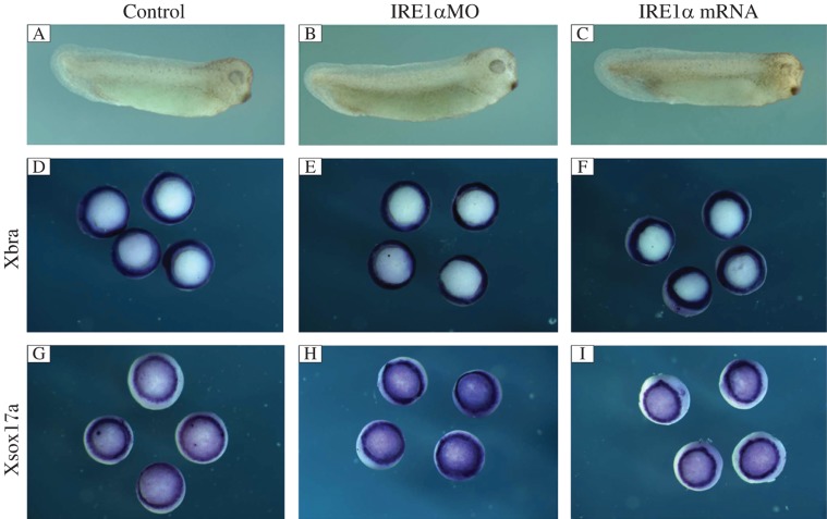 Fig. 1. xIRE1α does not affect mesoderm and endoderm formation.A: control MO injected embryo at tailbud stage. B and C: embryo injected with 50 ng xIRE1α MO or 1.5 ng xIRE1α mRNA. Overexpression or knockdown of xIRE1α did not change the expression of Xbra (DâF) and Xsox17a (GâI) at stage 10.5.