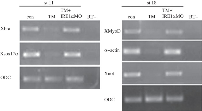 Fig. 3. Rescue effects of xIRE1α knockdown on gene expression.Control, TM treated and rescued embryos were collected at stage 11 or 18 and subjected to RT-PCR. Expression of mesodermal, endodermal, and neuroectodermal genes were inhibited in TM-treated embryos and rescued by xIRE1α knockdown. RT-: no-reverse transcriptase control.