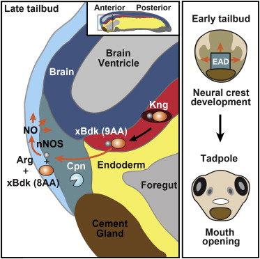 The extreme anterior domain (EAD) is a conserved embryonic region that includes the presumptive mouth. We show that the Kinin-Kallikrein pathway is active in the EAD and necessary for craniofacial development in Xenopus and zebrafish. The mouth failed to form and neural crest (NC) development and migration was abnormal after loss of function (LOF) in the pathway genes kng, encoding Bradykinin (xBdk), carboxypeptidase-N (cpn), which cleaves Bradykinin, and neuronal nitric oxide synthase (nNOS). Consistent with a role for nitric oxide (NO) in face formation, endogenous NO levels declined after LOF in pathway genes, but these were restored and a normal face formed after medial implantation of xBdk-beads into LOF embryos. Facial transplants demonstrated that Cpn function from within the EAD is necessary for the migration of first arch cranial NC into the face and for promoting mouth opening. The study identifies the EAD as an essential craniofacial organizer acting through Kinin-Kallikrein signaling.