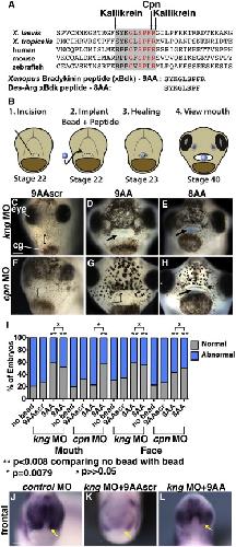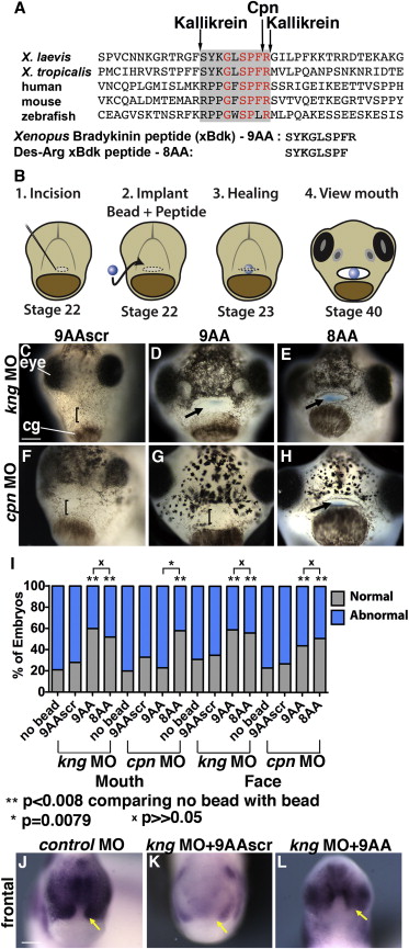Figure 3. Bradykinin-like Peptides Prevent cpn and kng Loss-of-Function Phenotypes (A) Amino acid sequence alignment of region around Bdk-l peptide. Gray highlights: Bdk-l peptide sequence; red: conserved amino acids; black arrows: Kallikrein and Cpn cleavage sites. Bdk-l (9AA) and Des-Arg Bdk-l peptides (8AA) used. (B) Experimental design. (C–H) Abnormal mouth phenotype after kng LOF prevented by 9AA and 8AA peptides, whereas in cpn morphants was prevented only by the 8AA peptide. (C) kng morphants implanted with 9AA scrambled (9AAscr) peptide bead (28% normal, n = 60). Embryos scored as abnormal if mouth failed to open, was tiny or asymmetric, nostrils failed to form, pigment was absent, or face was abnormally narrow. (D and E) kng morphant implanted with 9AA (D, 60% normal, n = 105) or 8AA bead (E, 57% normal, n = 75). (F) cpn morphants implanted with 9AAscr bead (mouth: 43% normal, n = 67; face: 27% normal, n = 67). (G and H) cpn morphants implanted with 9AA bead (mouth: 41% normal, n = 54; face: 44% normal, n = 54) or 8AA bead (mouth: 65% normal, n = 79; face: 51% normal, n = 79). Scale bar, 200 μm. (I) Graph depicting percent of morphants implanted with beads, displaying normal mouth and face formation. p values: one-tailed Fisher’s exact test. (J–L) Expression of neural crest marker sox9 in kng morphants implanted with 9AA bead. Arrow: normal extent of first arch cranial NC. (J) Wild-type expression of sox9 (100% normal, n = 13). kng morphant with a 9AAscr bead (K, 8% normal, n = 12) and 9AA bead (L, 39% normal, n = 13). Scale bar, 200 μm. |