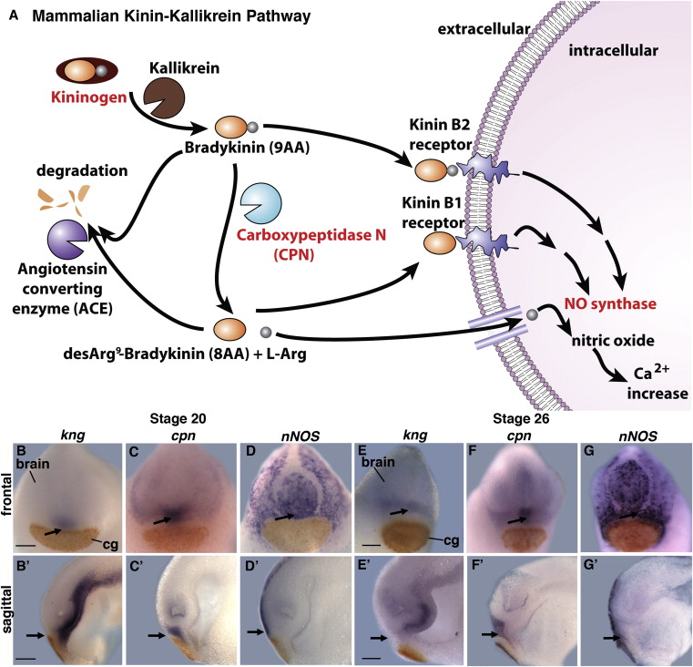Figure 1. Mammalian Kinin-Kallikrein Pathway and Putative Pathway Genes Are Expressed in the Developing Face (A) Adult mammalian Kinin-Kallikrein pathway (Kakoki and Smithies 2009). (B–G′) In situ hybridization for kng (B, B′, E, and E′), cpn (C, C′, F, and F′), and nNOS RNA (D, D′, G, and G′) (RNA is purple). Cement gland marker (xcg) is red. Arrow: presumptive mouth. cg, cement gland. (B–G) frontal views; (B′–G′) sagittal sections. Scale bars, 200 μm. |