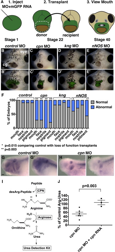 Figure 5. Local cpn Expression Is Required for Mouth Opening Local requirement of kng, cpn, and nNOS expression tested with EAD transplants. (A) Experimental design: donor morphant tissue was transplanted to uninjected sibling recipients. (B–E′) EAD transplant outcome from control, cpn, kng, or nNOS morphant donor tissue (control [B] 100% normal, n = 11; cpn [C] 28% normal, n = 14; kng [D] 83% normal, n = 24; nNOS [E] 61% normal mouth phenotype, 72% normal facial phenotype, n = 18). (B′–E′) Overlay of (B)–(E) with GFP fluorescence indicating donor tissue. Dots surround open mouths. Bracket: unopened mouth. Frontal view. Scale bar, 100 μm. (F) Quantification of structure depending on morphant background of facial tissue. (G–H′) sox9 expression in cpn morphant donor tissue transplants, compared with control morphant transplants. sox9 in situ hybridization in control morphant transplants (G, G′, 70% with normal expression, n = 10) and cpn morphant transplants (H and H′, 36% with normal expression, n = 11). Two representative embryos shown. Scale bar, 100 μm. (I and J) (I) Summary of urea assay for analysis of Cpn activity. (J) Chart summarizing level of urea derived from free Arg in cpn morphants or morphants coinjected with cpn RNA, as percent of urea derived from free Arg in control morphants. Urea levels in control morphants and wild-type embryos were equivalent. Each dot represents an independent experiment. p value: one-tailed t test. |