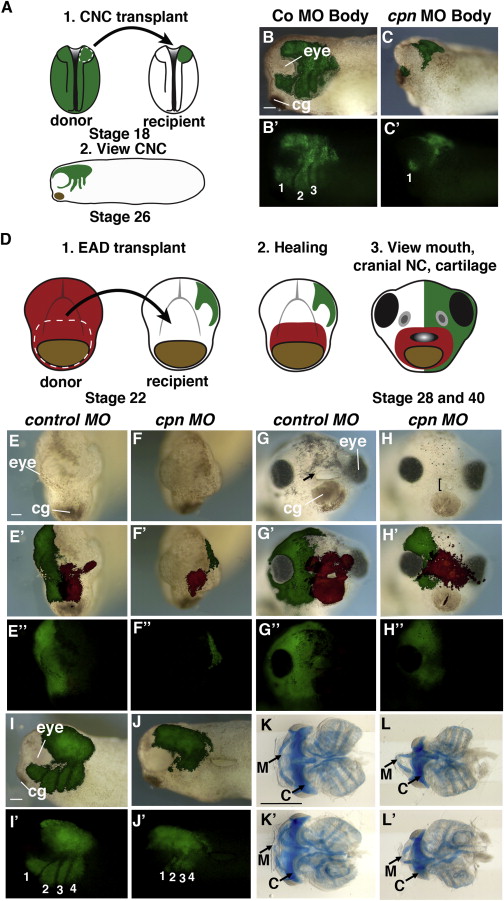 Figure 6. Global and local cpn Expression Is Required for Cranial Neural Crest Migration Global requirement for cpn expression tested with cranial NC transplants. Embryos scored as normal if three or four distinct branchial arches formed and migrated normally. (A) Experimental design: donor wild-type cranial NC transplanted into cpn morphant sibling recipients. (B–C′) (B and C) Cranial NC transplant outcomes in control and cpn morphant recipients with GFP fluorescence overlay, indicating location of donor transplant at stage 28 (control [B] 69% normal, n = 36; cpn [C] 27% normal, n = 29). (B′ and C′) GFP fluorescence of cranial NC in control and cpn morphant recipient. Numbers indicate branchial arches. Side view. cg, cement gland. Scale bar, 200 μm. (D) Experimental design: donor cpn morphant EAD transplanted into control morphant sibling recipients with fluorescent cranial NC. (E–H′′) (E, F, G, and H) Bright-field view of control and cpn morphant transplants at stages 28 and 40. (E′, F′, G′, and H′) Cranial NC in control and cpn morphant EAD recipients at stages 28 and 40 with GFP fluorescence overlay, indicating location of cranial NC and mCherry fluorescence overlay, indicating location of EAD transplant. (control stage 28 [E′] 85% normal, n = 41; cpn stage 28 [F′] 57% normal, n = 42; control stage 40 [G′] 63% normal, n = 38; cpn stage 40 [H′] 17% normal, n = 35). (E′′, F′′, G′′, and H′′) GFP fluorescence of cranial NC in control and cpn morphant EAD recipients at stage 28 and 40. Arrow: Open mouth. Bracket: unopened mouth. Frontal view. cg, cement gland. Scale bar, 100 μm. (I–J′) (I and J) Cranial NC outcome in control and cpn morphant EAD recipients with GFP fluorescence overlay, indicating location of cranial NC at stage 28. (I′ and J′) GFP fluorescence of cranial NC in control and cpn morphant EAD recipients. Numbers indicate branchial arches. Side view. cg, cement gland. Scale bar, 200 μm. (K–L′) Cartilage in control morphant EAD recipients (K, K′ 78% normal, n = 14) and cpn morphant EAD recipients (L, L′ 6% normal, n = 16). (K and L) Ventral view. (K′ and L′) Dorsal view. M, Meckel’s cartilage. C, ceratohyal cartilage. Scale bar, 100 μm. |