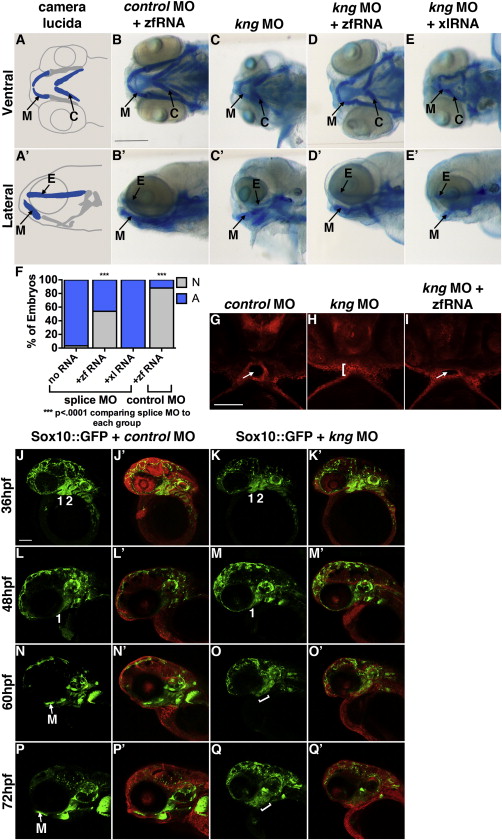 Figure 7. Function of kng in Craniofacial Development Is Conserved in Zebrafish (A and A′) Camera lucida of facial cartilages. E, ethmoid plate; C, ceratohyal cartilage; M, Meckel’s cartilage. (B–E′) kng loss of function using splice morpholinos and rescue with zebrafish (zf) kng mRNA. Embryonic cartilage scored at 5 dpf after Alcian blue staining in three independent experiments. Scale bar, 250 μm. (B and B′) Control morphants coinjected with mRNA were normal (88% normal, n = 50). (C, C′, E, and E′) kng morphants and kng morphants coinjected with 200 ng Xenopus kng mRNA showed abnormal facial cartilage. Meckel’s cartilage was truncated, boxy, and pointed at an abnormal angle. The ceratohyal cartilage was positioned at an abnormal angle, perpendicular to the midline. (kng [C and C′] 3% normal, n = 61; kng mo plus frog mRNA [E and E′] 0% normal, n = 65). (D and D′) kng morphants coinjected with 200 ng zebrafish (zf) mRNA showed partial rescue. Embryos scored as partially rescued if Meckel’s cartilage was longer, more rounded, and pointed dorsally and if ceratohyal cartilage pointed more anteriorly, compared to kng morphants (54% partial rescue, n = 89). (F) Quantification of phenotypes. p values: one-tailed Fisher’s exact test. N, normal or partially rescued phenotype. A, abnormal phenotype. (G–I) Ventral views of mApple-injected embryos at 48 hpf. White arrow: open mouth. White bracket: closed mouth. Scale bar, 100 μm. (G) Control morphants (100% normal, n = 5). (H) kng splice morphants failed to form open mouths (0% normal, n = 6). (I) kng splice morphants coinjected with 200 ng zf mRNA had open mouths (67% normal, n = 6). (J–Q′) Confocal images of Sox10::GFP zebrafish coninjected with 75 pg mApple and 4 ng control morpholino (100% normal, n = 5) or 4 ng kng splice morpholino (0% normal, n = 5). Paired images of the same embryo show GFP signal alone and GFP with mApple. Numbers indicate pharyngeal arches (PA). Bracket: uncondensed/disorganized cartilage. Lateral view. M, Meckel’s cartilage. Scale bar, 100 μm. (J–K′) At 36 hpf, NC has migrated into the face of both morphant and control embryos to form first and second PA. (L–M′) At 48 hpf, the first PA has begun to extend under eye to form the lower jaw in both morphant and control embryos. (N and N′) At 60 hpf, first PA has condensed into Meckel’s cartilage in control embryos. (O and O′) At 60 hpf, first PA remains disorganized in morphants and does not condense. (P and P′) At 72 hpf, Meckel’s cartilage is prominent in control embryos. (Q and Q′) At 72 hpf, cartilage of the lower jaw remains disorganized and uncondensed in morphants. |