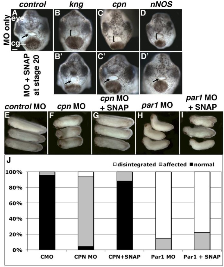 Figure S5. NO donor (SNAP) prevented cpn, kng and nNOS LOF phenotypes when injected late, and SNAP rescue is a specific effect, related to Figure 4. (A-D) Embryos were injected with morpholino at the one cell stage. NO donor (SNAP) was injected into the presumptive mouth region at stage 20. Phenotypes of kng (B), cpn (C), and nNOS (D) loss of function using antisense morpholinos are described in detail in Fig. 2. (B’-D’) Embryos injected with NO donor late, at stage 20. The craniofacial phenotype of kng, cpn and nNOS LOF was prevented by injection of NO donor into the EAD. (kng (B’) 54% normal, n= 48; cpn (C’) 79% normal, n=34; nNOS (D’) 53% normal, n=15) Scale bar: 100 m. (E-J) NO specificity for the Kinin-Kallikrein pathway was tested by co-injecting SNAP and morpholino at the one cell stage. Embryos were scored at stage 26. (E) Control morphants. (F-G) The phenotype of cpn LOF was prevented by injection of NO donor SNAP with 82% normal embryos. (H-I) No rescue was obtained when SNAP was injected with par1 morpholino with 0% normal embryos. Par1 morpholino sequence and phenotype were published by Ossipova et al. 2005. (J) Quantification of results. |